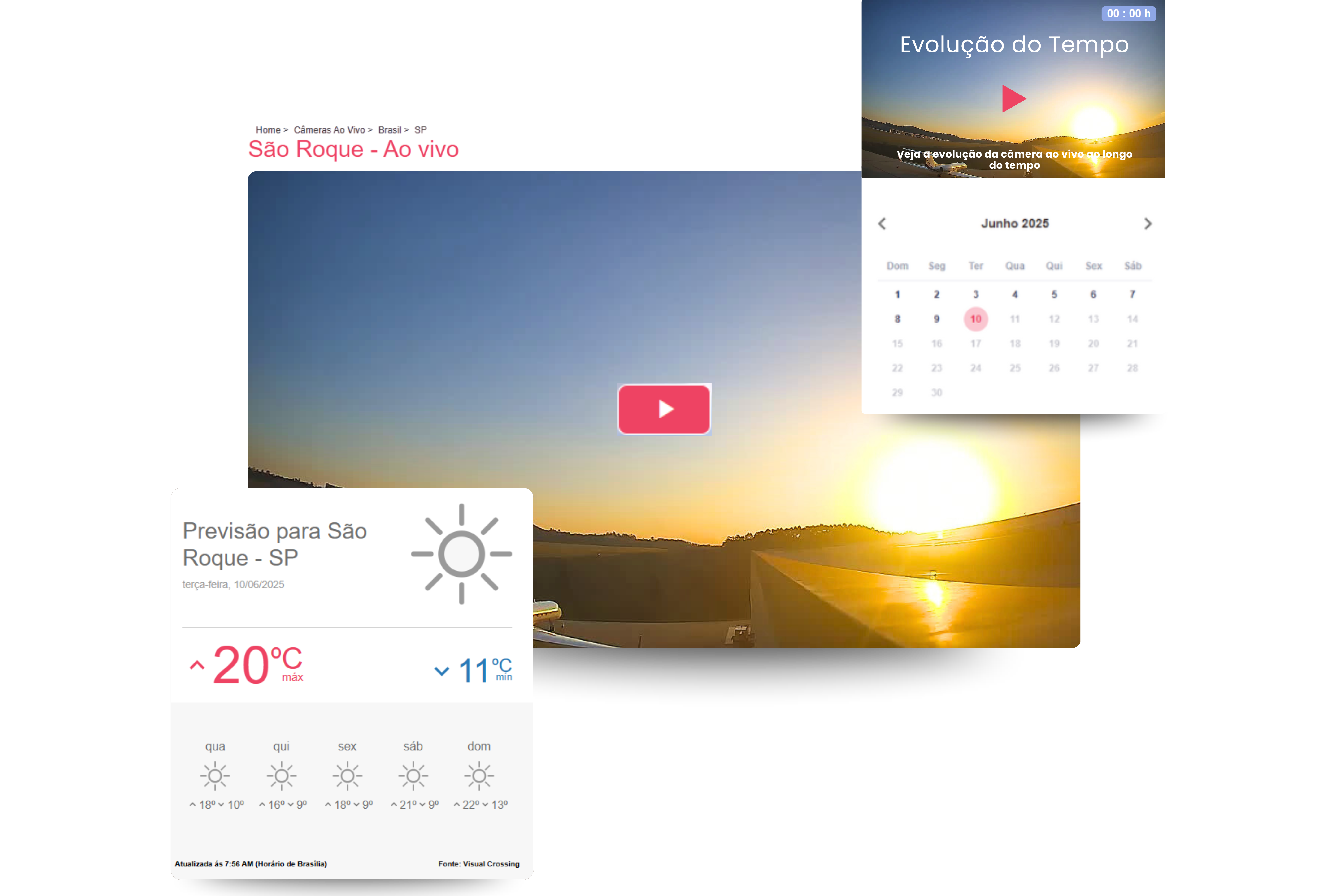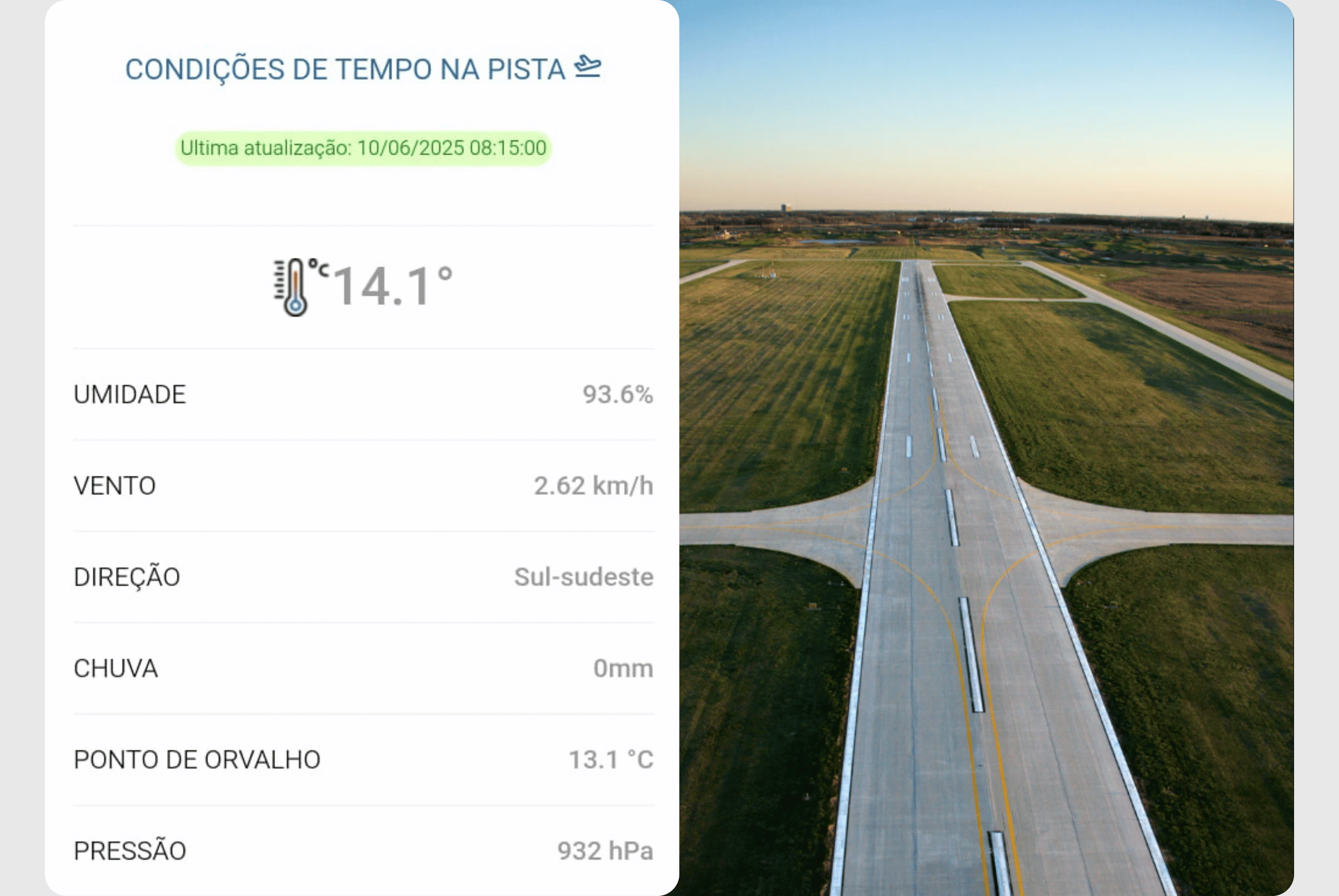 Monitoramento climático ao vivo por câmeras e estações meteorológicas dedicadas exclusivamente à sua operação aeronáutica.